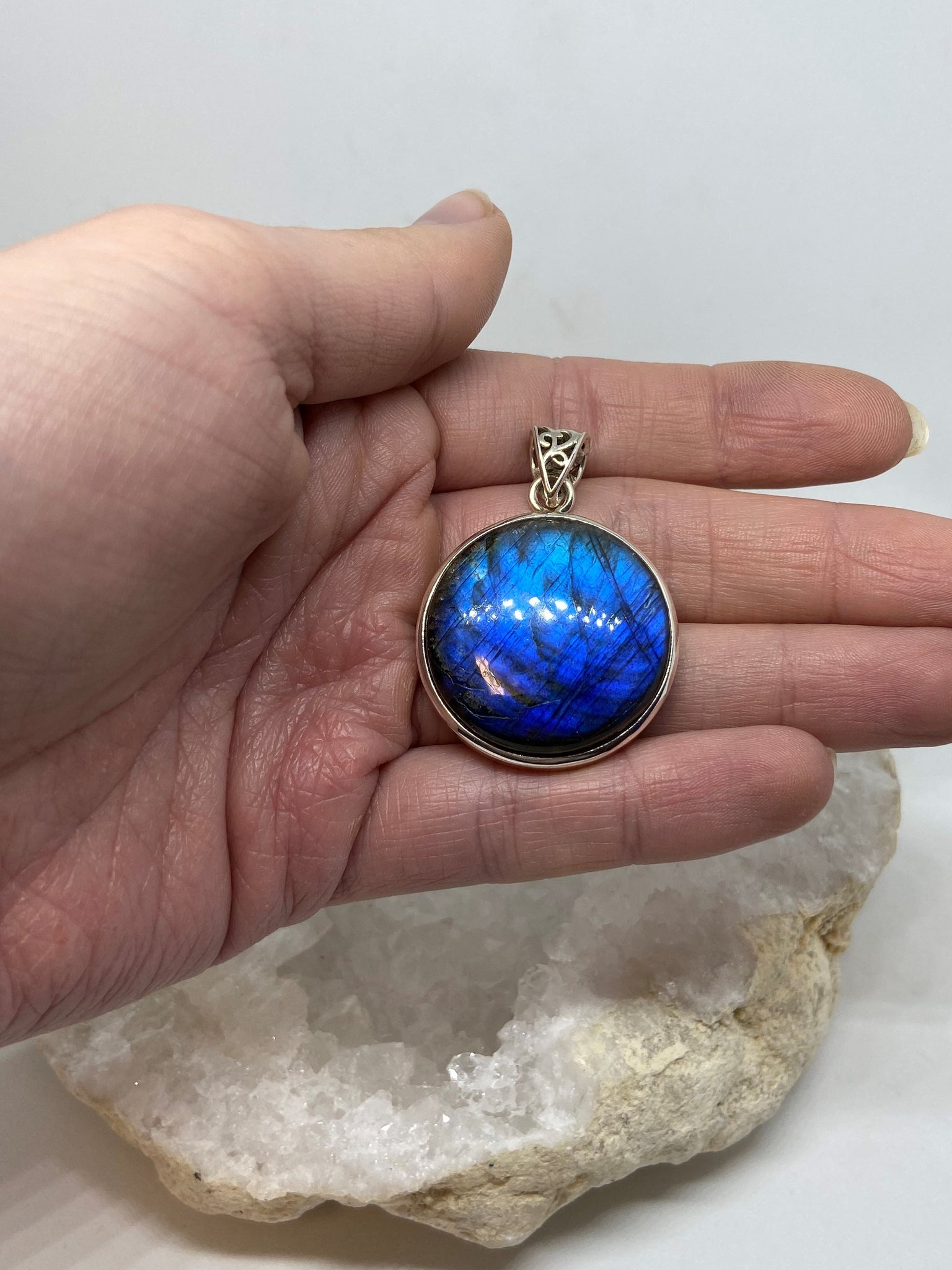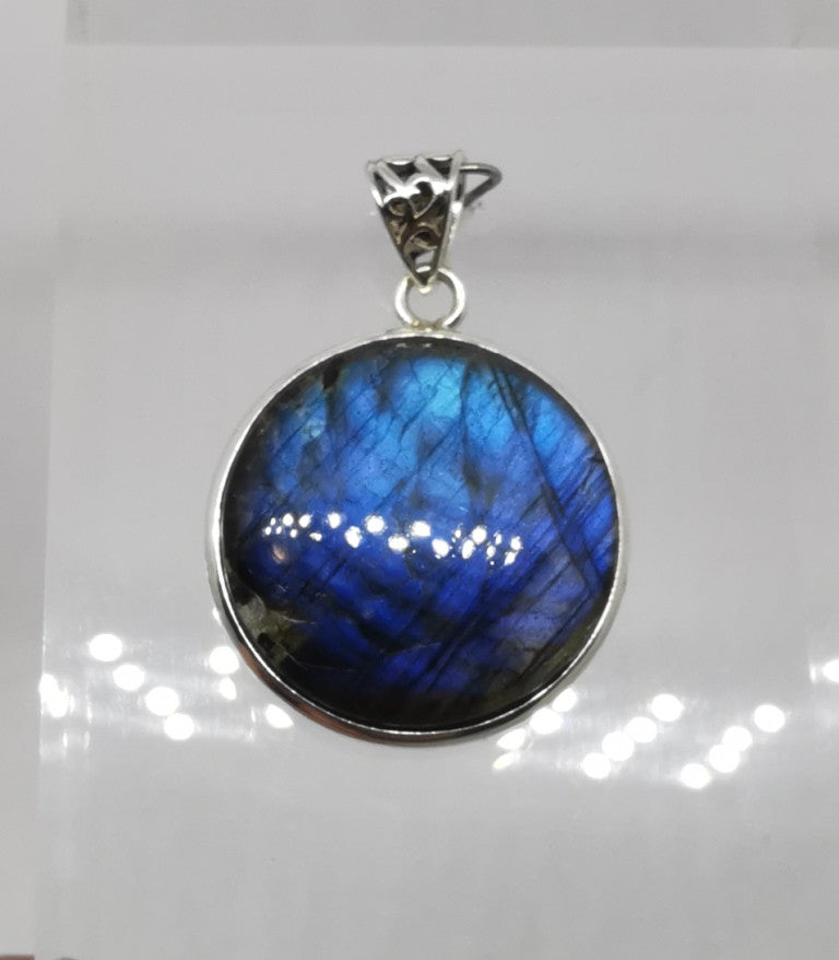 Pendentif et bélière en Argent serti d'une pierre de Labradorite de forme ronde