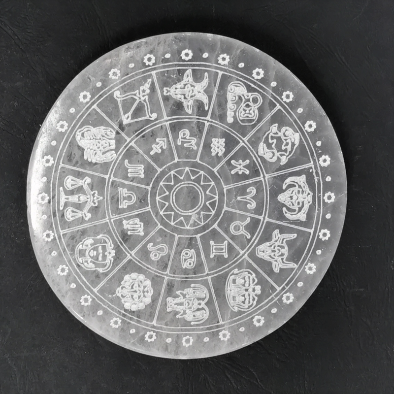 Plaque de rechargement en pierre naturelle de Sélénite et gravure des Signes du Zodiaque