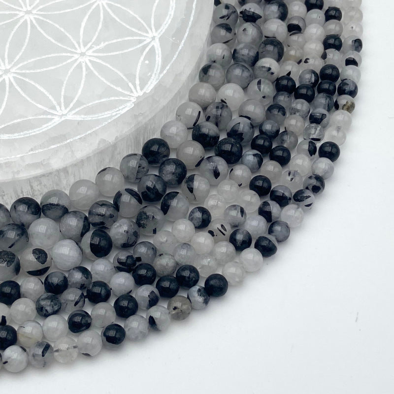 Rang de perles naturelles de Tourmaline Noire et Quartz