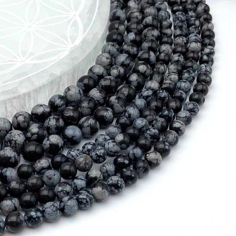 Rang de perles naturelles d'Obisidienne Flocon de Neige effet Moucheté